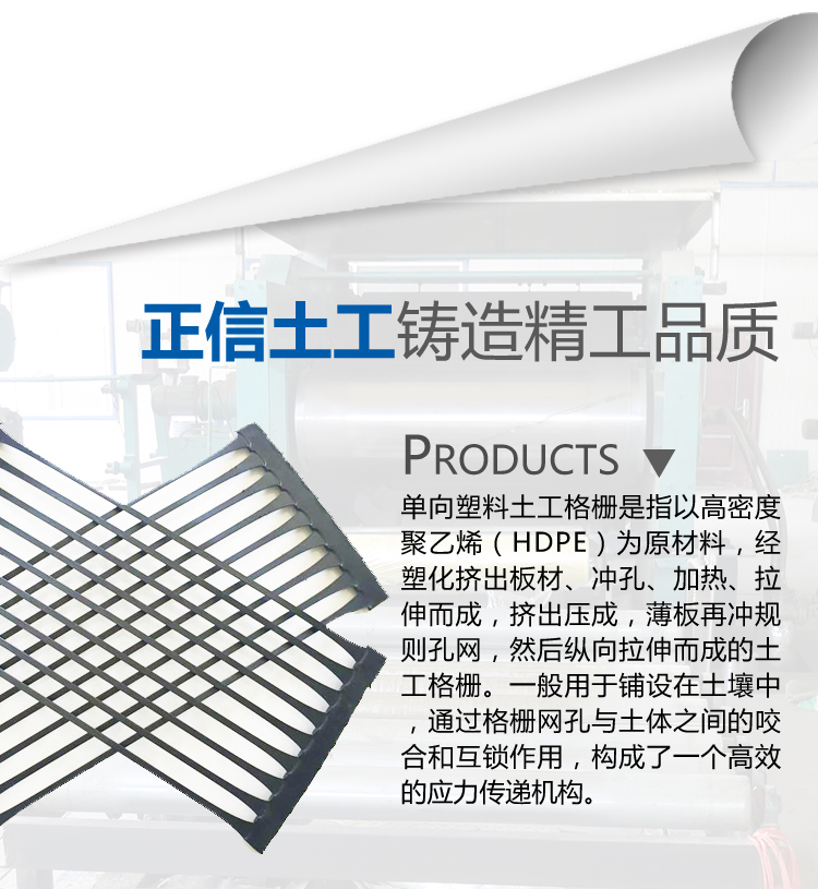 單向塑料土工格柵是指以高密度聚乙烯(HDPE)為原材料,經(jīng)塑化擠出板材、沖孔、加熱、拉伸而成,擠出壓成,薄板再?zèng)_規(guī)則孔網(wǎng),然后縱向拉伸而成的土工格柵。一般用于鋪設(shè)在土壤中,通過格柵網(wǎng)孔與土體之間的咬合和互鎖作用,構(gòu)成了一個(gè)高效的應(yīng)力傳遞機(jī)構(gòu),使局部載荷能迅速有效地?cái)U(kuò)散到大面積的土體中去,從而實(shí)現(xiàn)降低局部破壞應(yīng)力,提高工程使用壽命之目的。